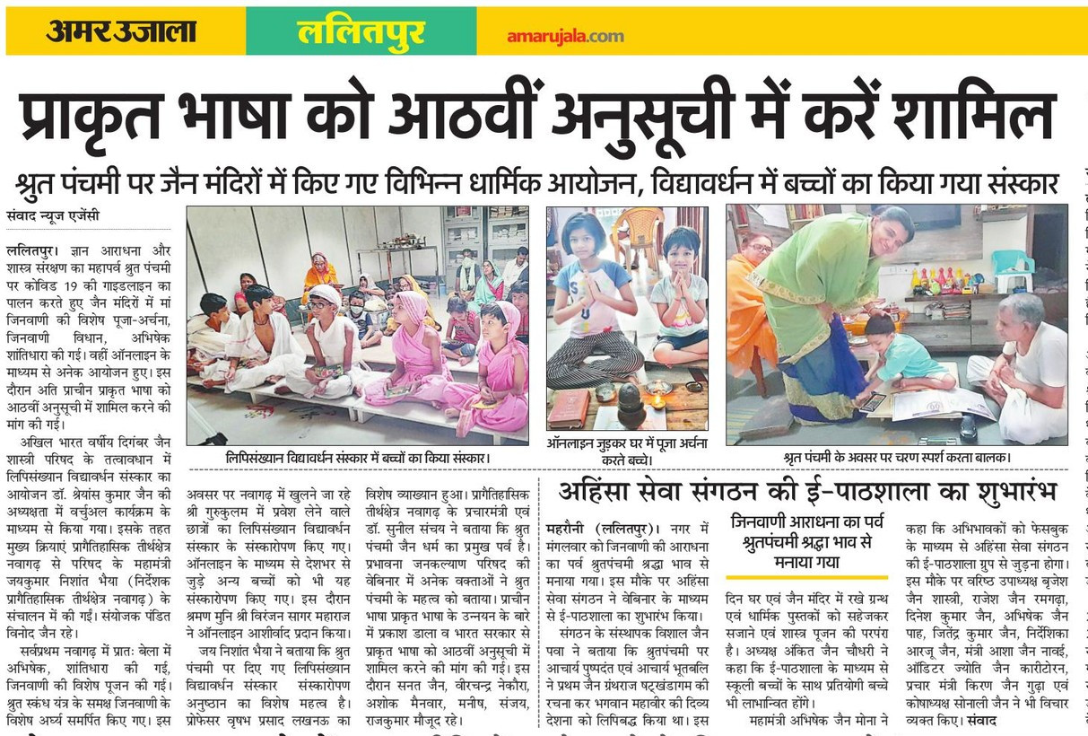 15जून 2021 श्रुत पंचमी: श्री गुरुकुलम् नवागढ़ में प्रथम प्रवेश करने वाले छात्रों का लिपि संख्यान विद्यावर्द्धन संस्कार आचार्य श्री (श्री विशुद्ध सागर जी, श्री श्रुत सागर जी, श्री विनिश्चयसागर जी), मुनि श्री (श्री सुप्रभ सागर जी, श्री आदित्य सागर जी, श्री विरंजन सागर जी) के सान्निध्य..... विवरण-1 , विवरण-2 , विवरण-3 , विवरण-4 , विवरण-5 ______________________________________________________________________________________________________________