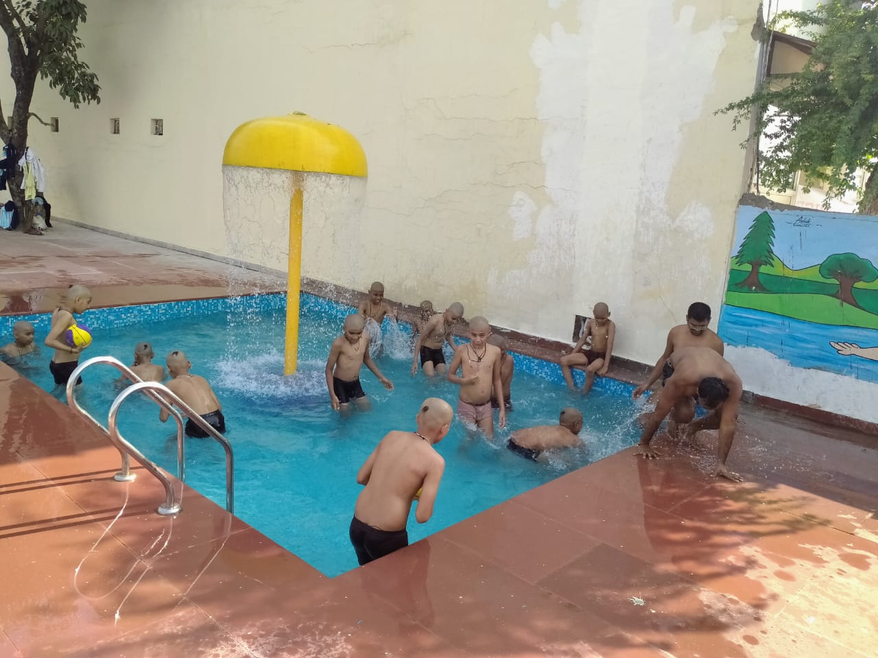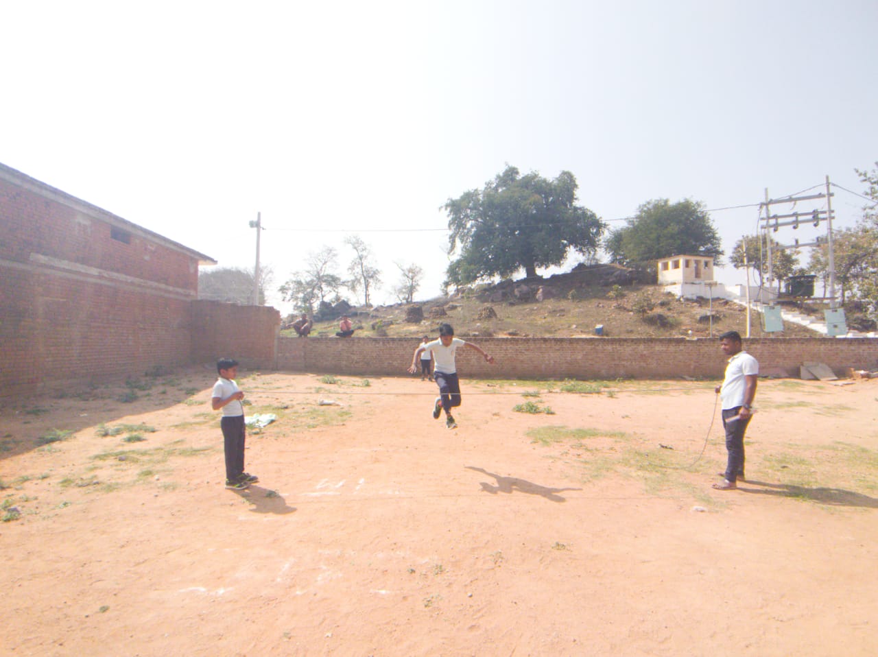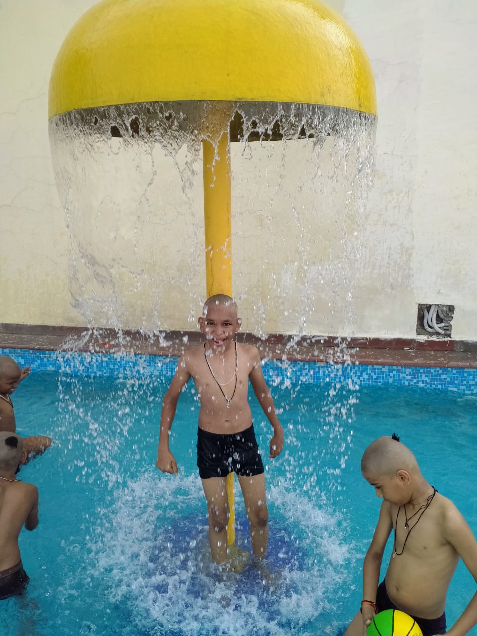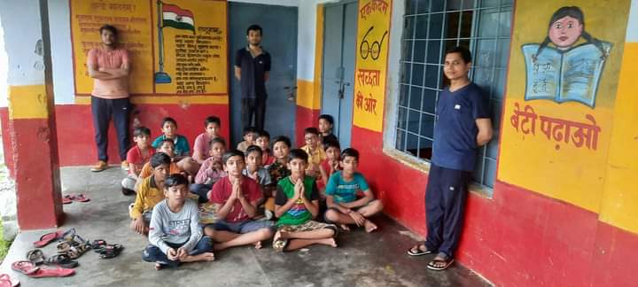 मिडिल स्कूल के प्रांगण में वर्षा का आनंद लेते हुए योग का अभ्यास करते हुए। साथ मे पंडित संजय शास्त्री,श्री ईशान जैन एवं विकाश जैन।