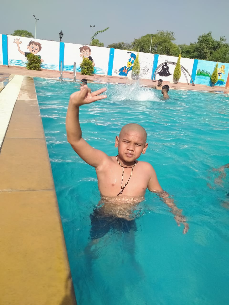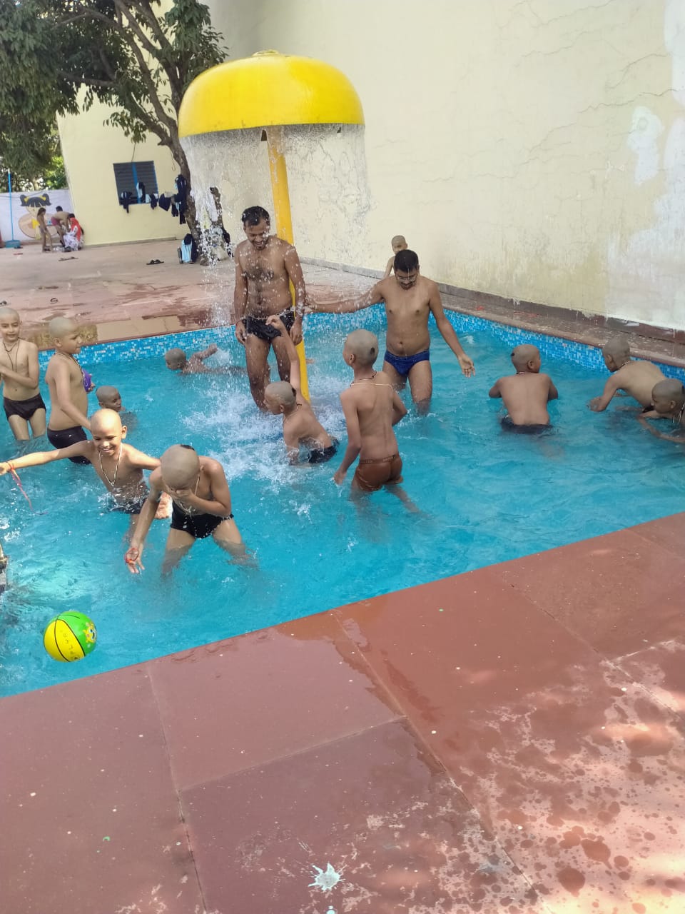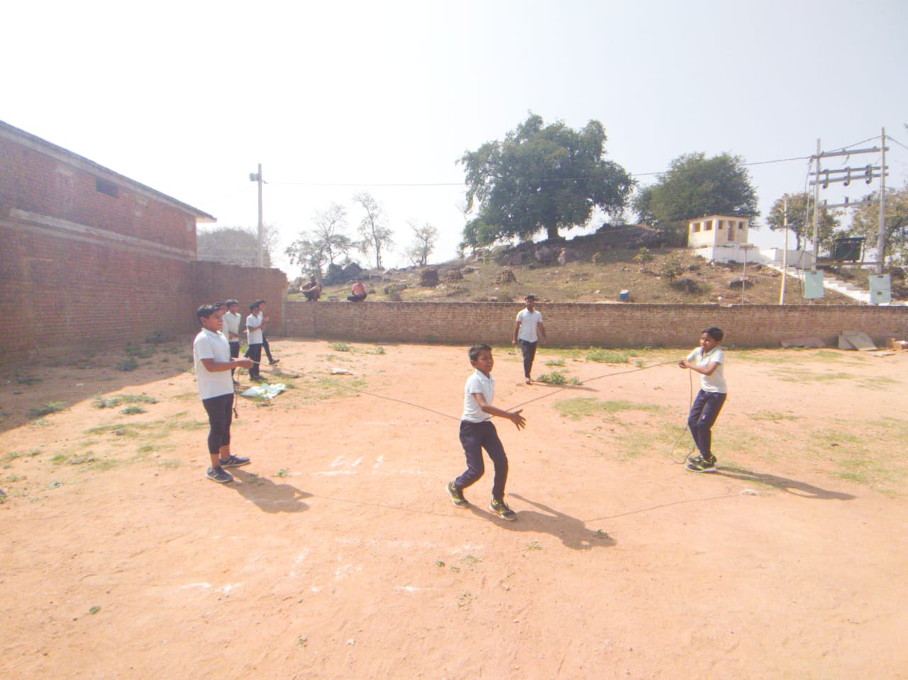 मिडिल स्कूल के प्रांगण में वर्षा का आनंद लेते हुए योग का अभ्यास करते हुए। साथ मे पंडित संजय शास्त्री,श्री ईशान जैन एवं विकाश जैन।