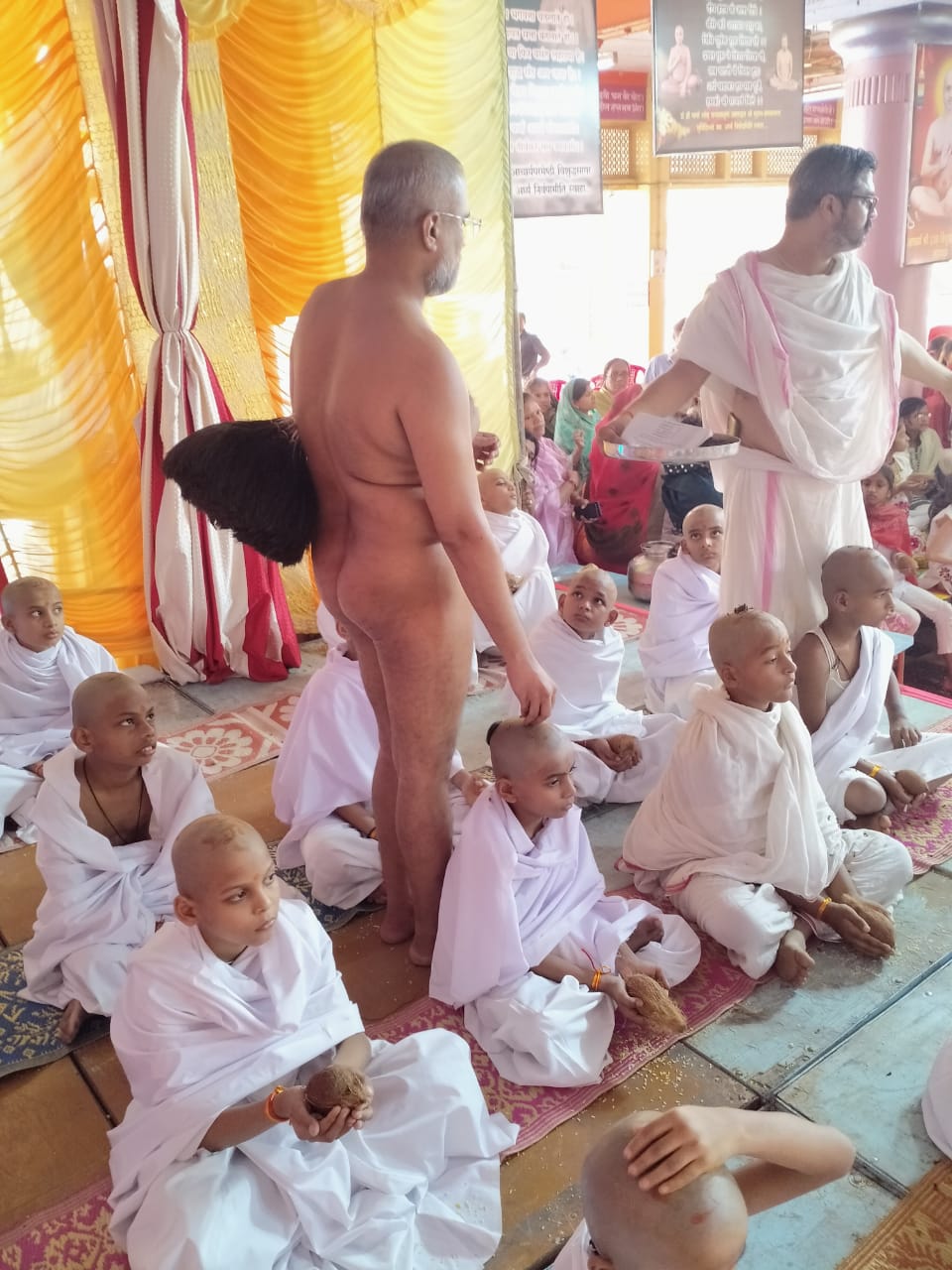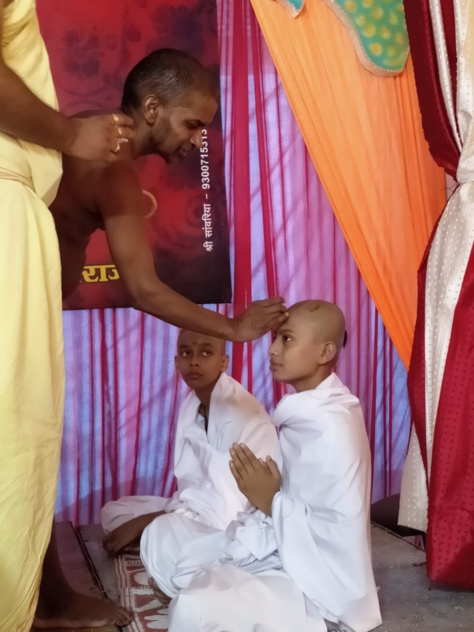 15 अक्टूबर 2021: उपनयन संस्कार के कुछ छाया चित्र मुनिद्वय के चरणों वंदन करते श्री नवागढ़ गुरुकुलम के छात्र एवम चर्चा करते हुय।