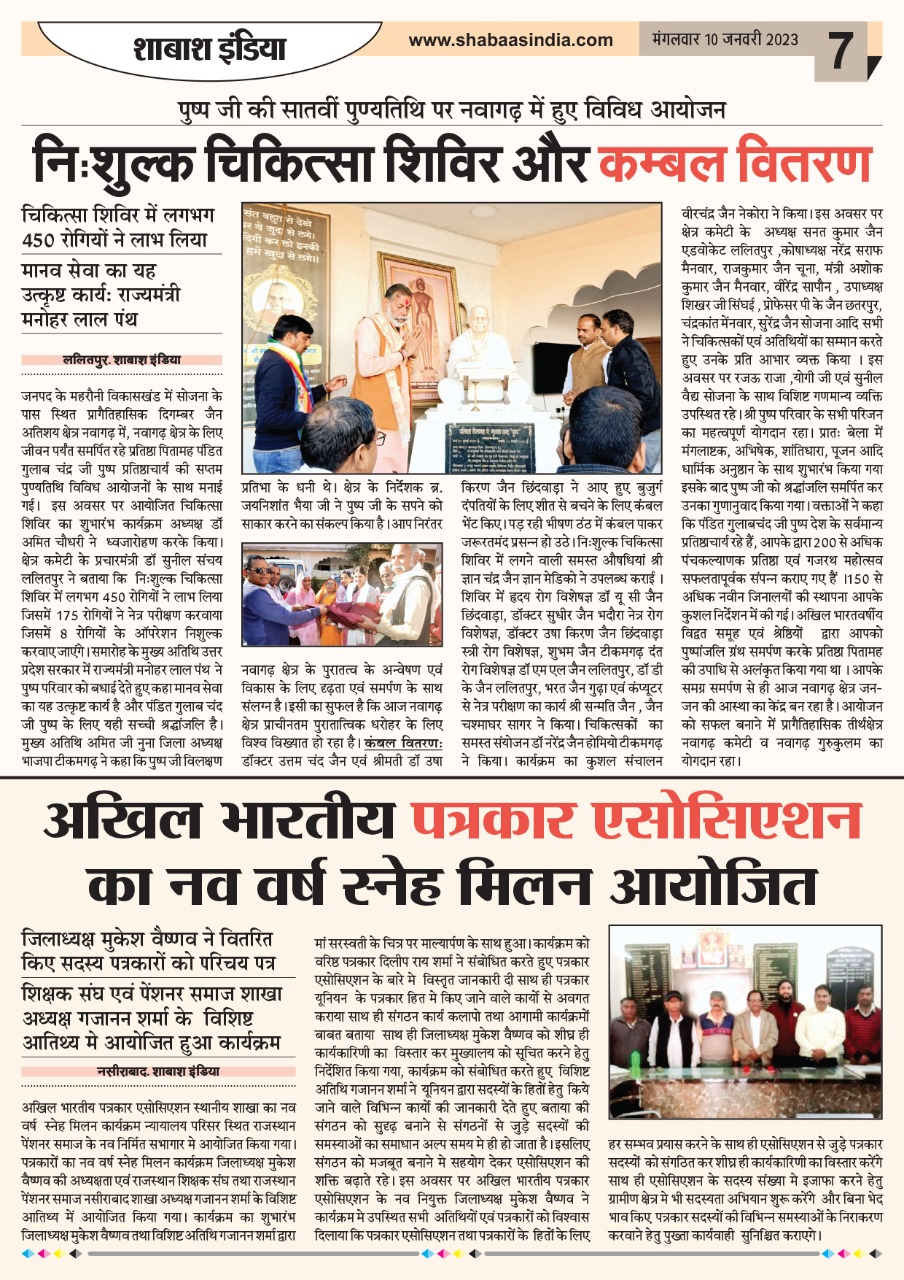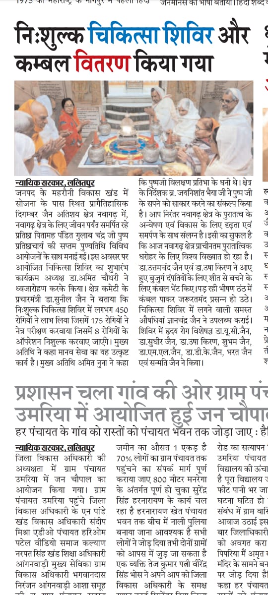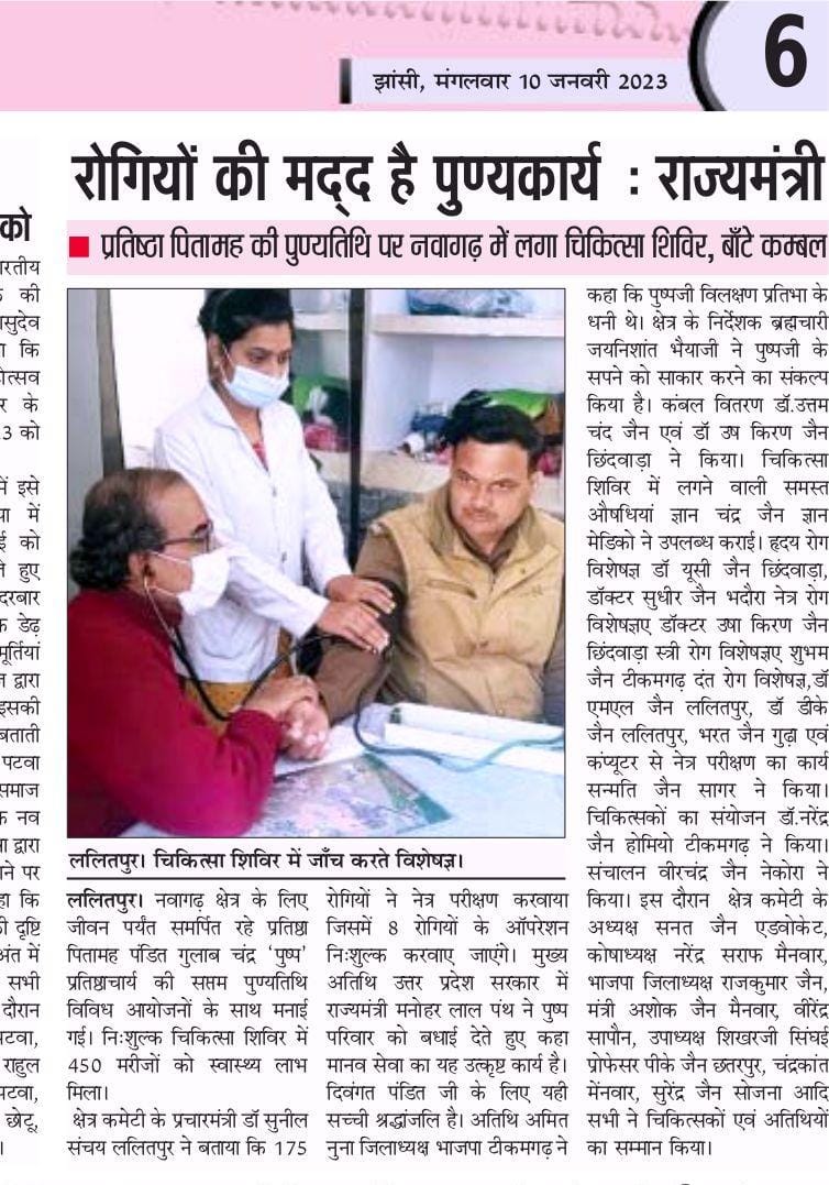 8 जनवरी 2023 को प्रातः 11 बजे से प्रतिष्ठा पितामह पं. गुलाब चंद जी पुष्प की स्मृति में उनके परिवार जनों द्वारा चिकित्सा शिविर, नेत्र परीक्षण एवं आंखों के ऑपरेशन निशुल्क संपन्न किए।महा मस्तकाभिषेक एवं चिकित्सा शिविर-2022