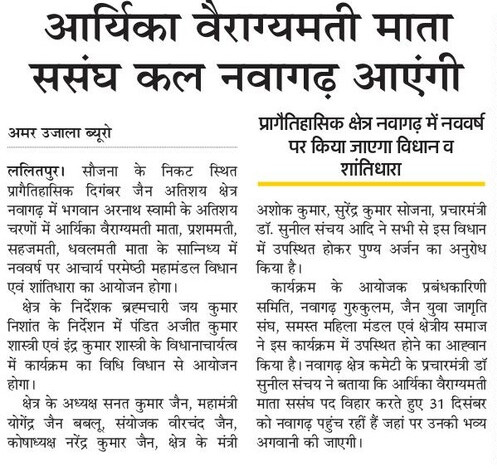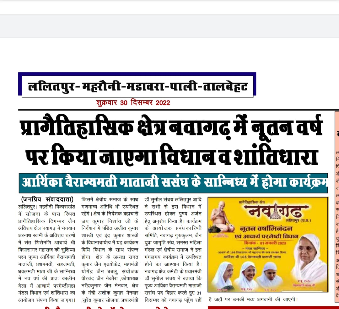 30 दिसंबर 2022: आर्यिका वैराग्यमती माता ससंघ कल नवागढ़ आएंगी न्यूज पेपर-1 , न्यूज पेपर-2 ,न्यूज पेपर-3