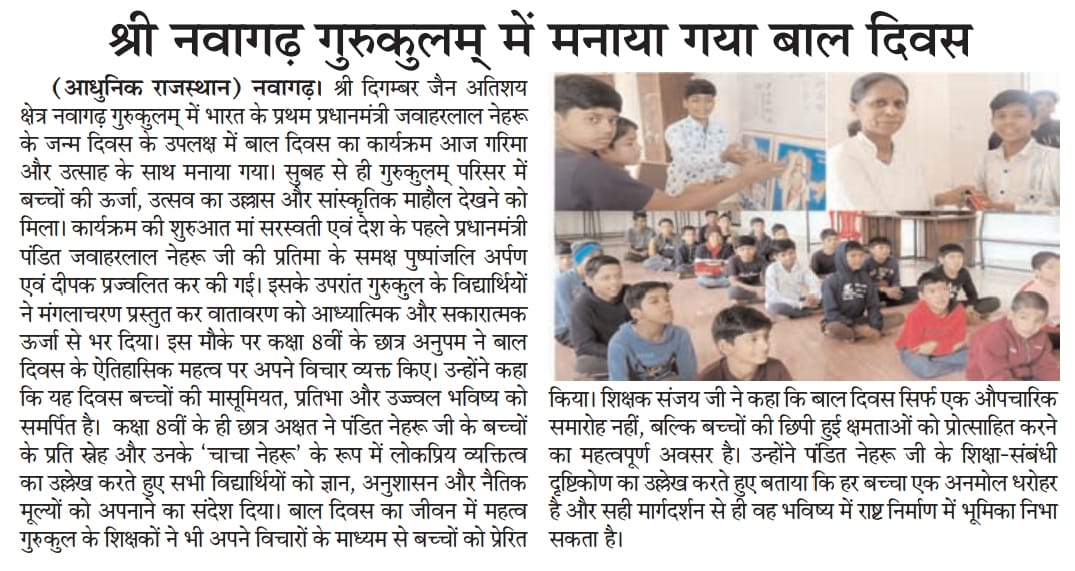 अतिशय क्षेत्र नवागढ़ में विद्यार्थियों और शिक्षकों ने नेहरू जी के आदर्शों व शिक्षा के महत्व पर रखे विचार, बच्चों को उपहार वितरित, कार्यक्रम सकारात्मक ऊर्जा के साथ सम्पन्न हुआ।